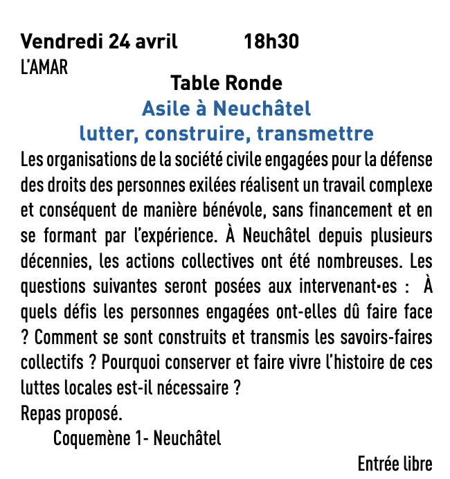 Vendredi 24 avril: table-ronde « Mémoires, transmissions et actualité des luttes pour le droit d’asile dans le canton de Neuchâtel »